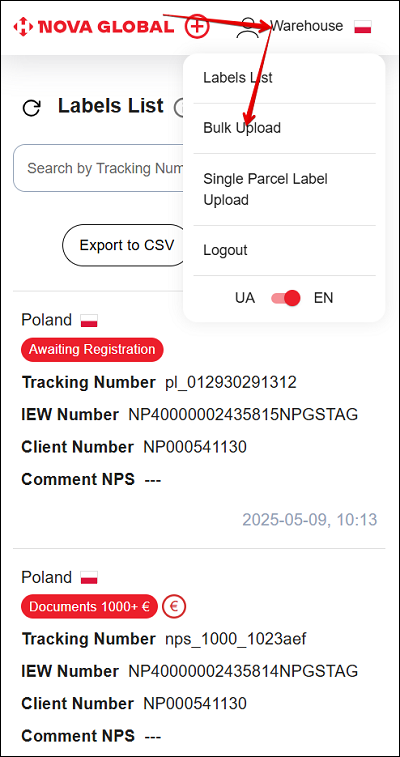 To download labels in bulk, click the Warehouse user profile icon and select Bulk Upload from the menu that opens.