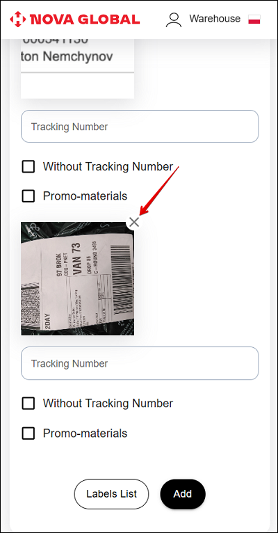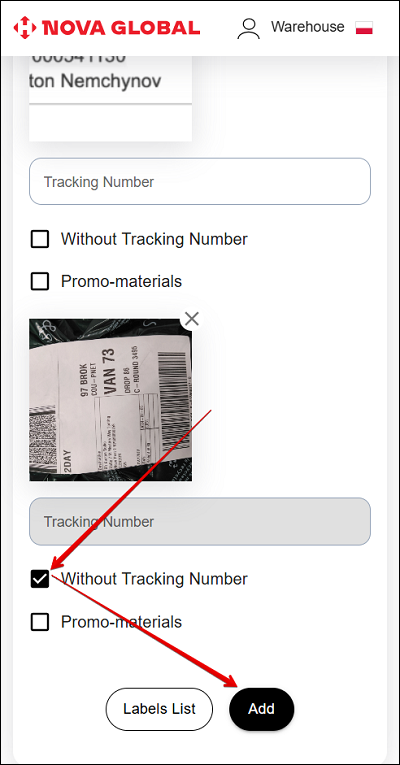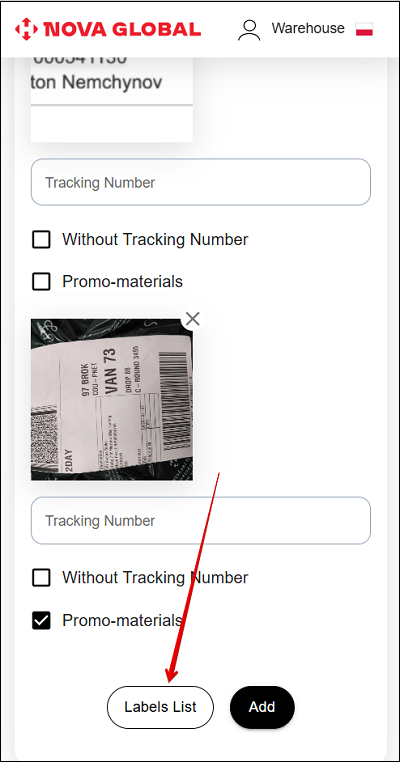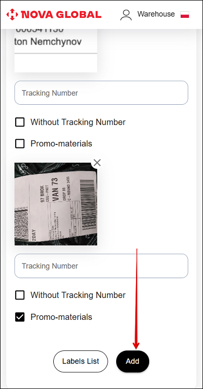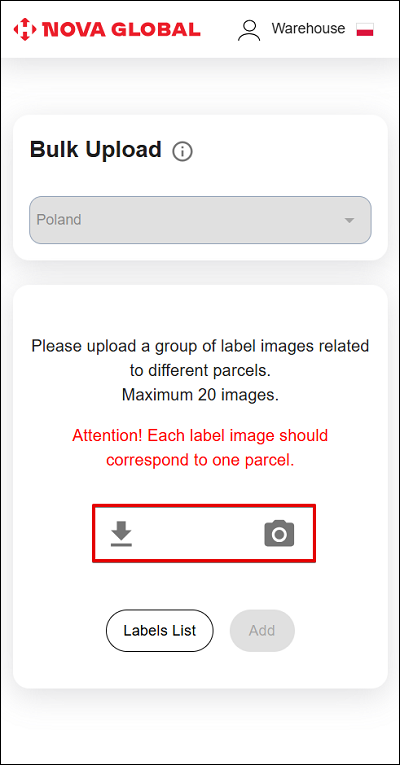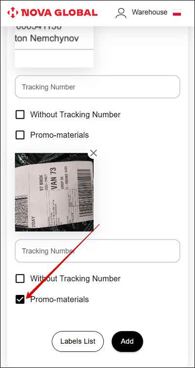 During bulk loading, the warehouse employee can mark the parcel as promotional materials. Upload or take a photo of the label (up to 20 images) and mark the Promo-materials checkbox.