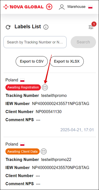 A grey envelope icon will appear in the list - a mark for parcels with promotional materials.