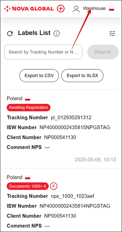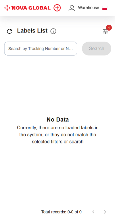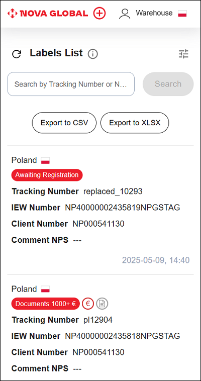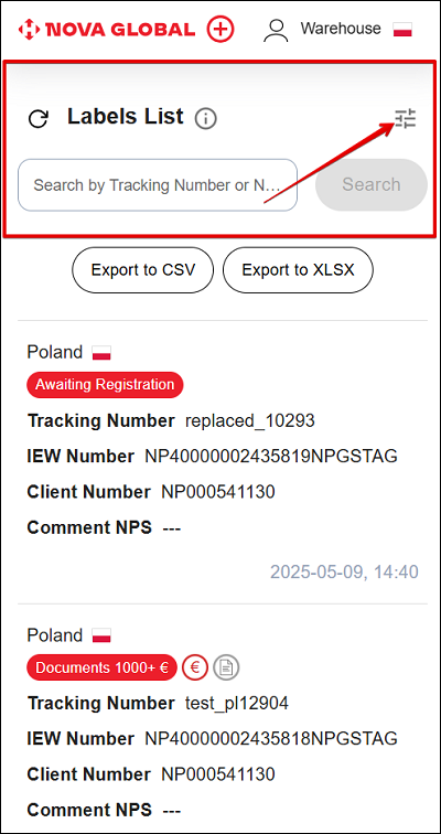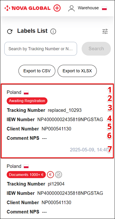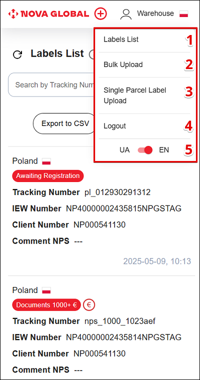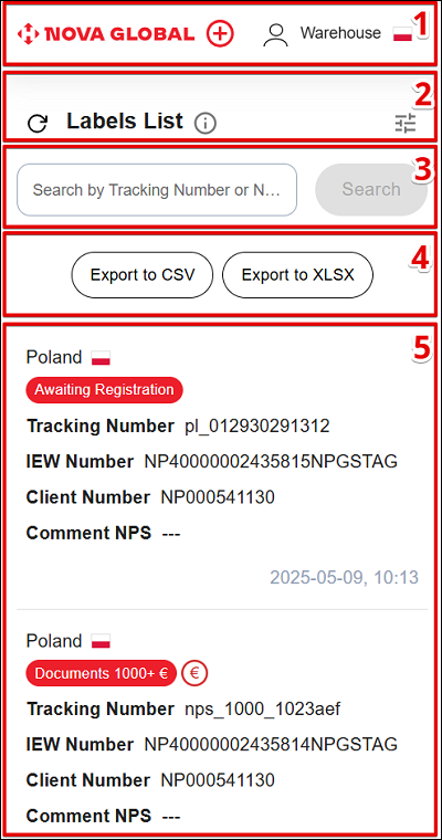 | 3 | Search engine and filters | Allows you to search for labels by track number and filter labels by their date, status, and commentaries left by manager The status filter combines all possible internal and system statuses of labeled parcels See Search engine and filters for more information |