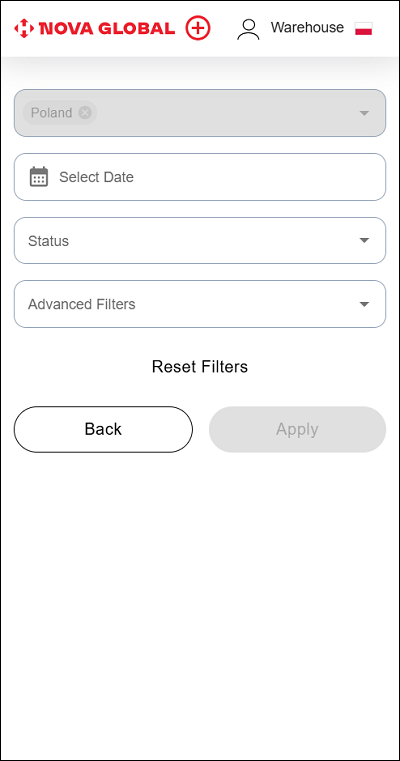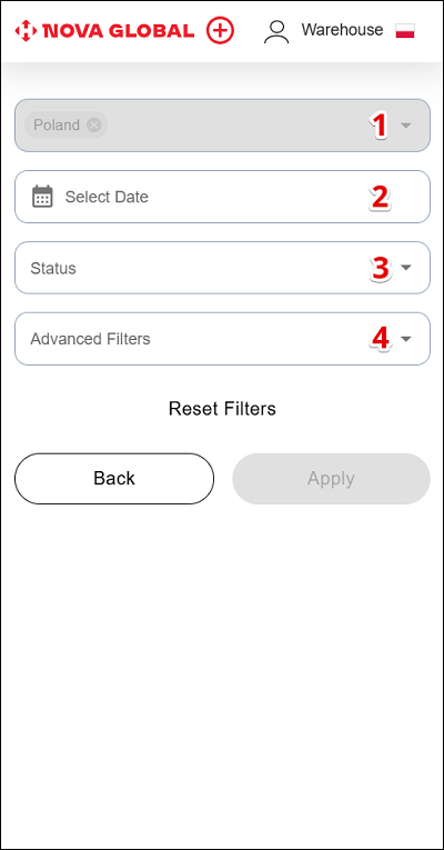 To apply the search by selected statuses, click the Apply button. To reset the search by filters, press the Back button.