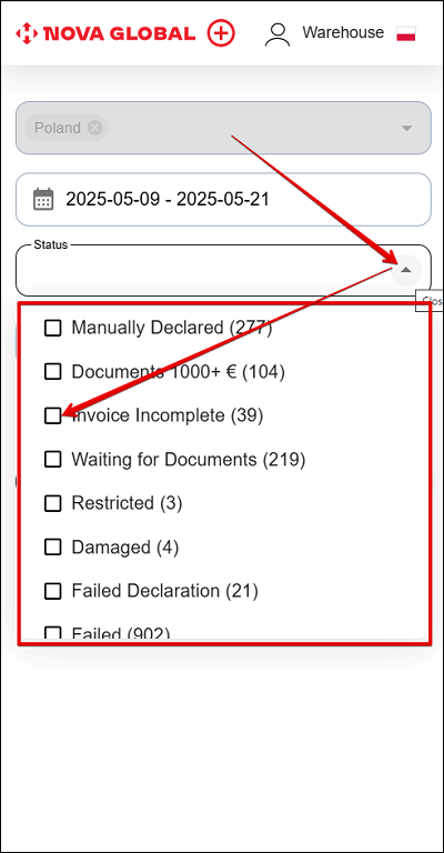 | 2 | Tick the checkbox. You can select one or more statuses |