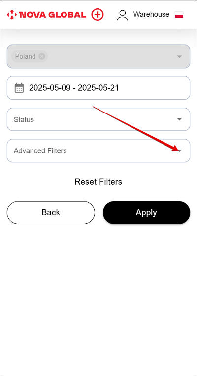 To open the filter list, click the Expand icon in the Advanced Filters field.