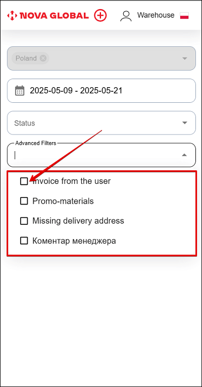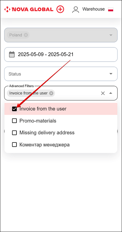 The Invoice from the user checkbox shows parcels in which the invoice was added by the user.