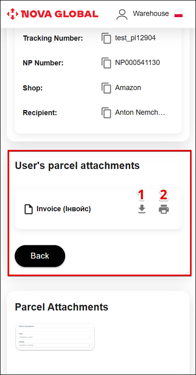 If the parcel is marked as Invoice from the user, the User`s parcel attachments block will appear on its page. This means that the customer has added the invoice himself. A warehouse employee can: