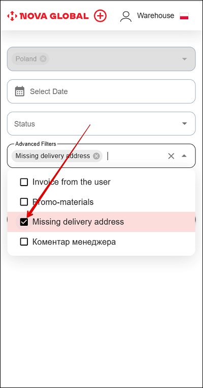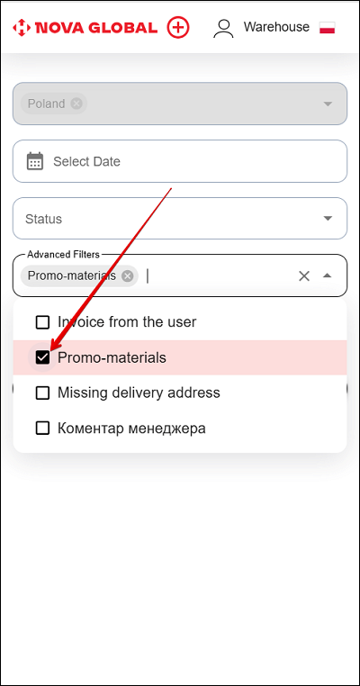 The Promo-materials filter allows you to display envelope parcels to easily distinguish them from regular parcels. Tick the Promo-materials checkbox and click Apply.