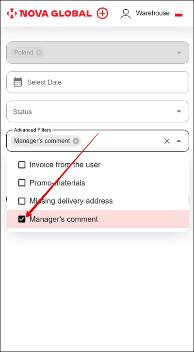 By checking the Manager's comment box, you can display the parcels that contain a manager's comment. The comment icon will be displayed on the right side of such parcels.
