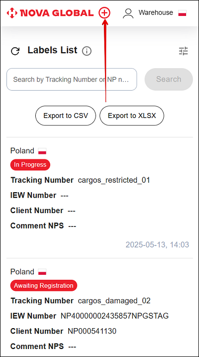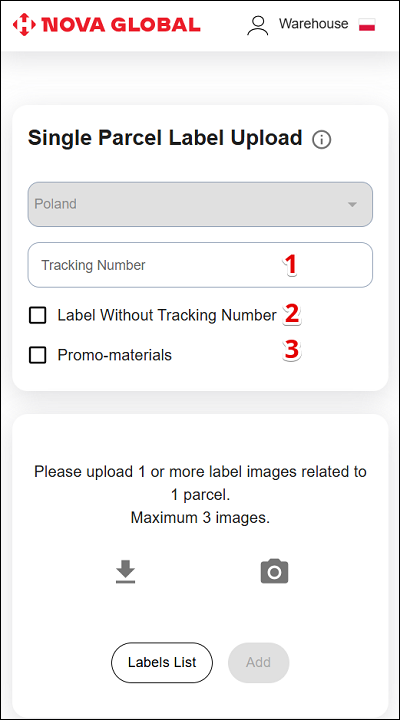 - If the bar code or QR with the tracking number is missing or significantly damaged on the label, it cannot be scanned or recognized, then you must check the Label Without Tracking Number checkbox;