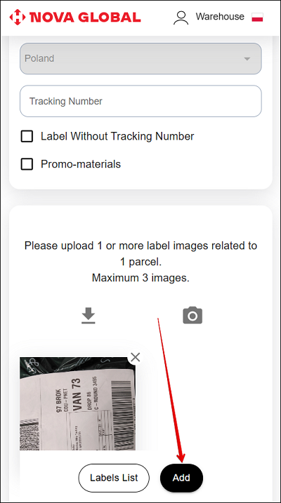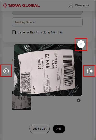 After adding a photo label, you need to add the Tracking Number value from a barcode or QR code by scanning.