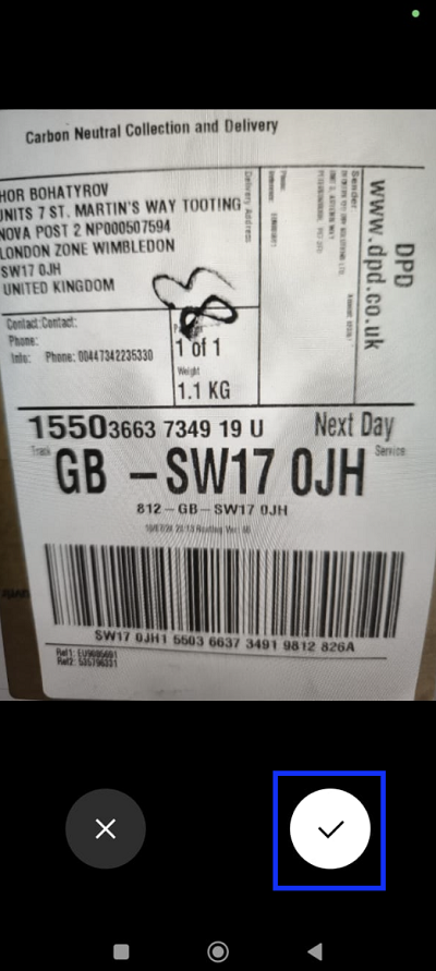 The label photo must be clear, horizontal, and readable from left to right. Click the Confirm button icon, if the label photo meets these conditions.