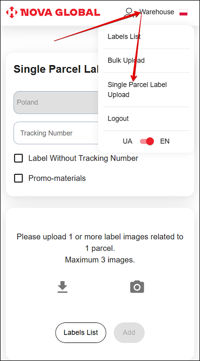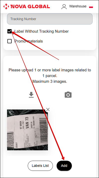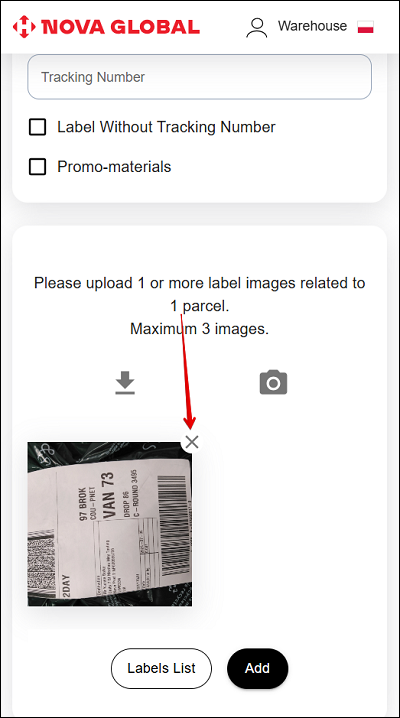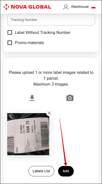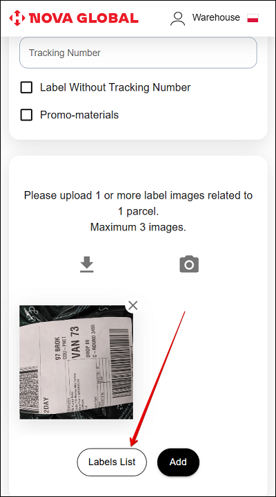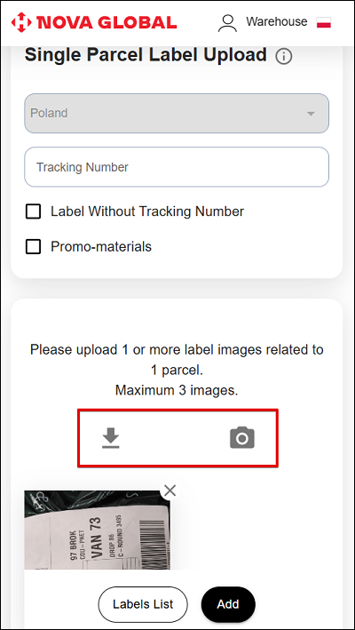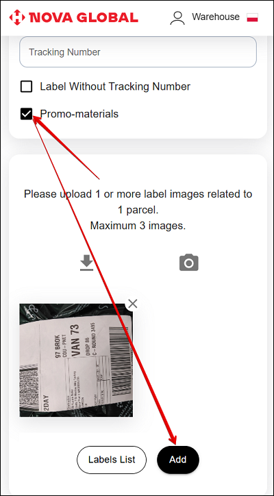 When uploading labels for 1 parcel, the warehouse employee can mark the parcel as promotional materials. Upload or take a photo of 1 or more images of labels related to the same parcel (up to 3 images) and mark the Promo-materials checkbox.