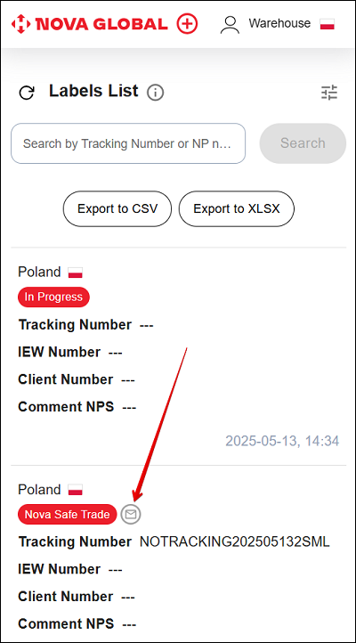 A grey envelope icon will appear in the list - a mark for parcels with promotional materials.