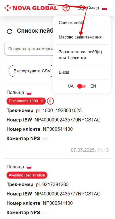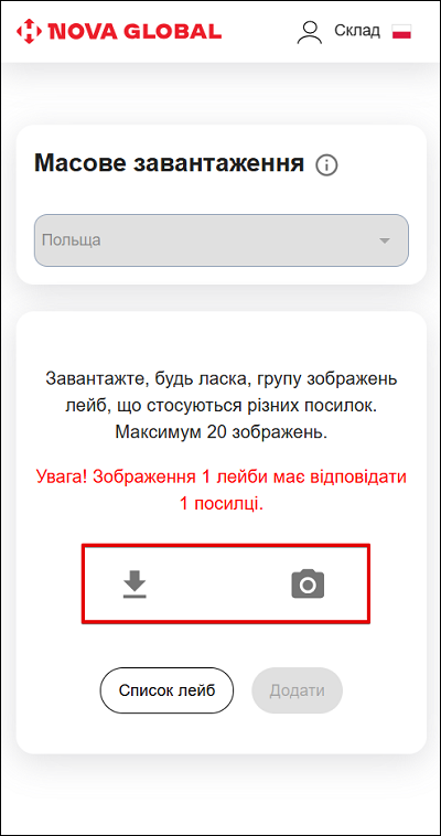 Масове завантаження лейб дозволяє за один раз завантажити максимум 20 лейб до 20 різних посилок.