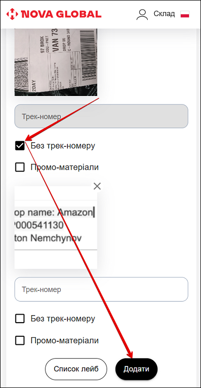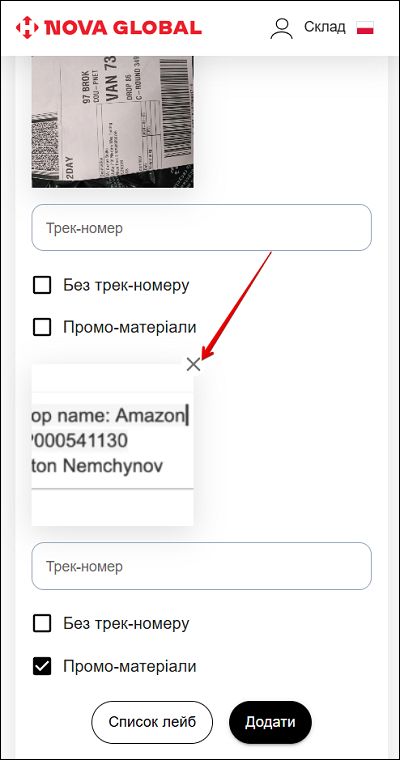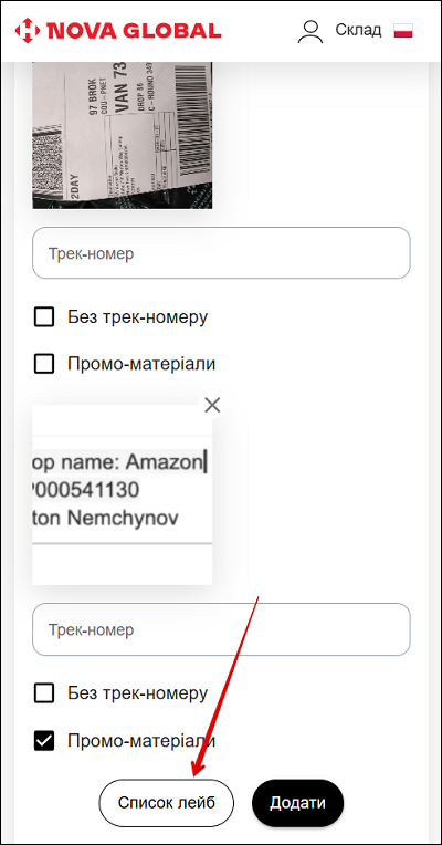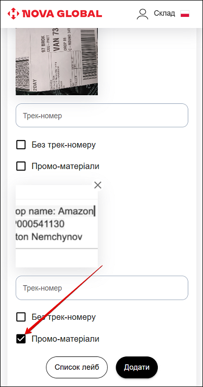 Під час масового завантаження співробітник складу може позначити посилку як промо-матеріали. Завантажте або зробіть фото лейби (до 20 зображень), та позначте чек бокс Промо-матеріали.